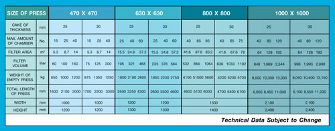 • Available in multiple sizes, plate styles, filter cloths, and operating pressures to meet specific slurry characteristics